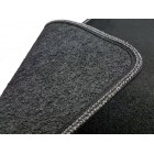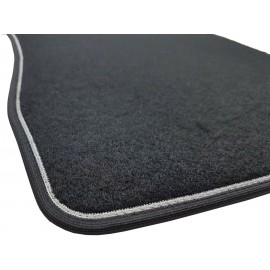 Bordatura perimetrale in tessuto bicolore nero con rigolo grigio chiaro, dotato di strap antiscivolo su tutto il perimetro del tappeto e su tutti i pezzi che forma il set della vostra auto