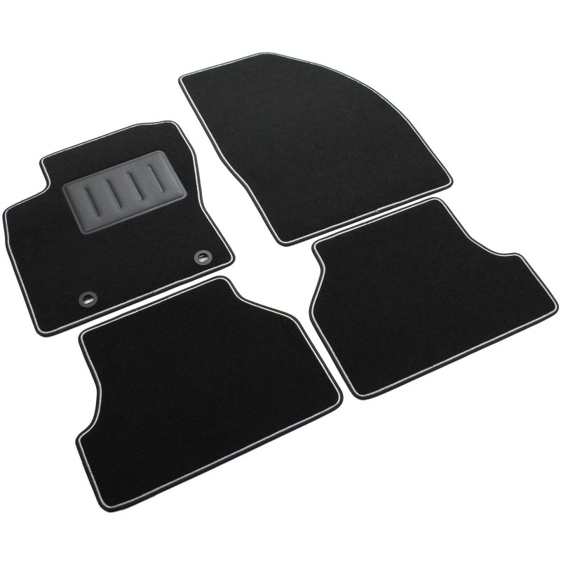 Bordatura perimetrale in tessuto bicolore nero con rigolo grigio chiaro, dotato di strap antiscivolo su tutto il perimetro del tappeto e su tutti i pezzi che forma il set della vostra auto